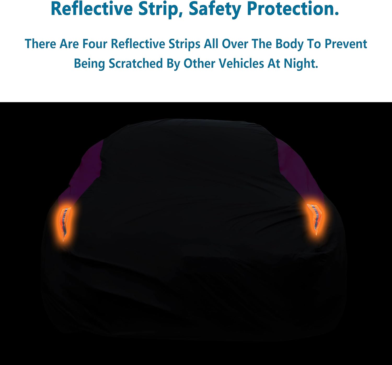 The multi-layer fabric is highly waterproof and features a UV-resistant coating to prevent fading. Keeps your car dry in rain and snow while protecting the exterior from sun damage, extending the life of the cover.